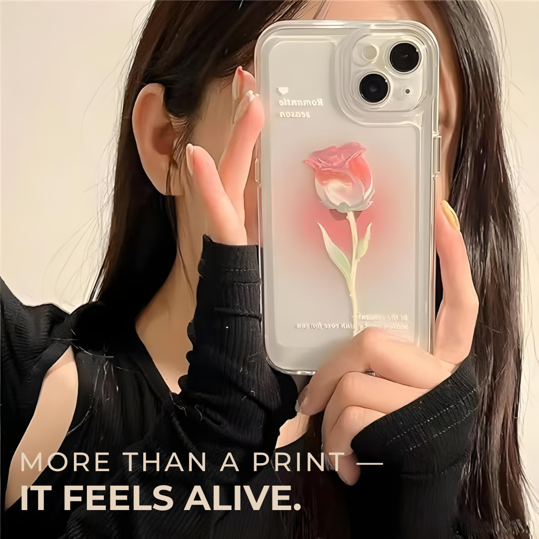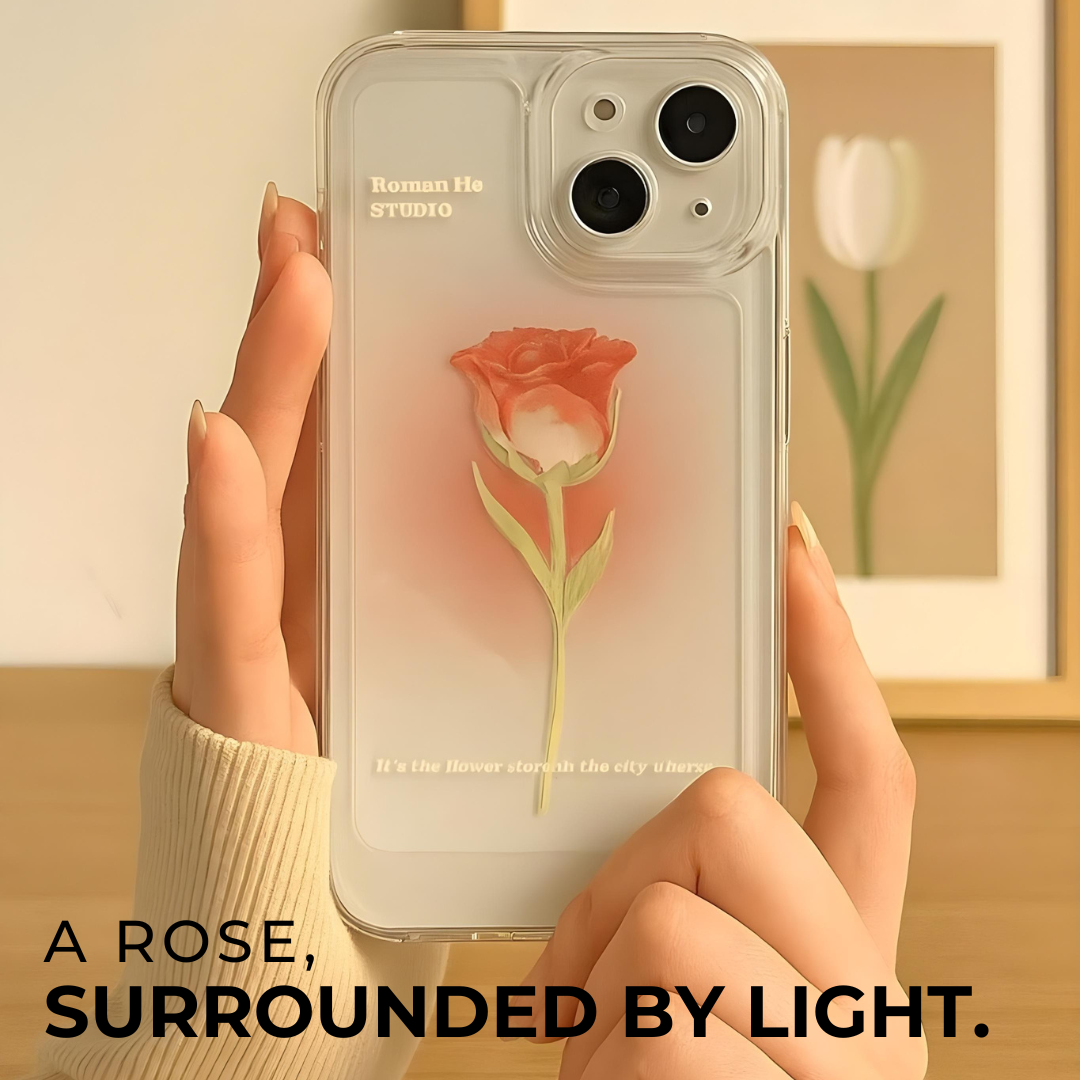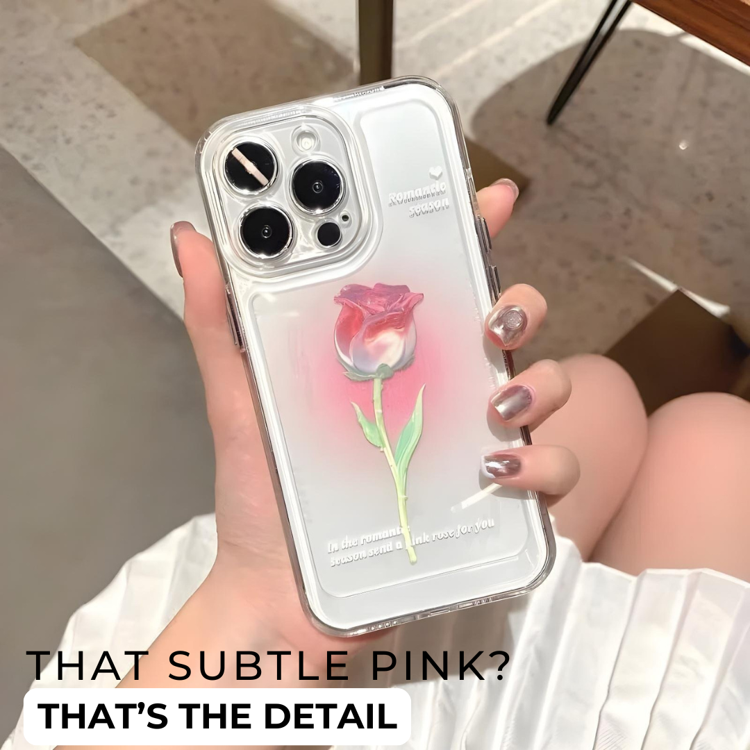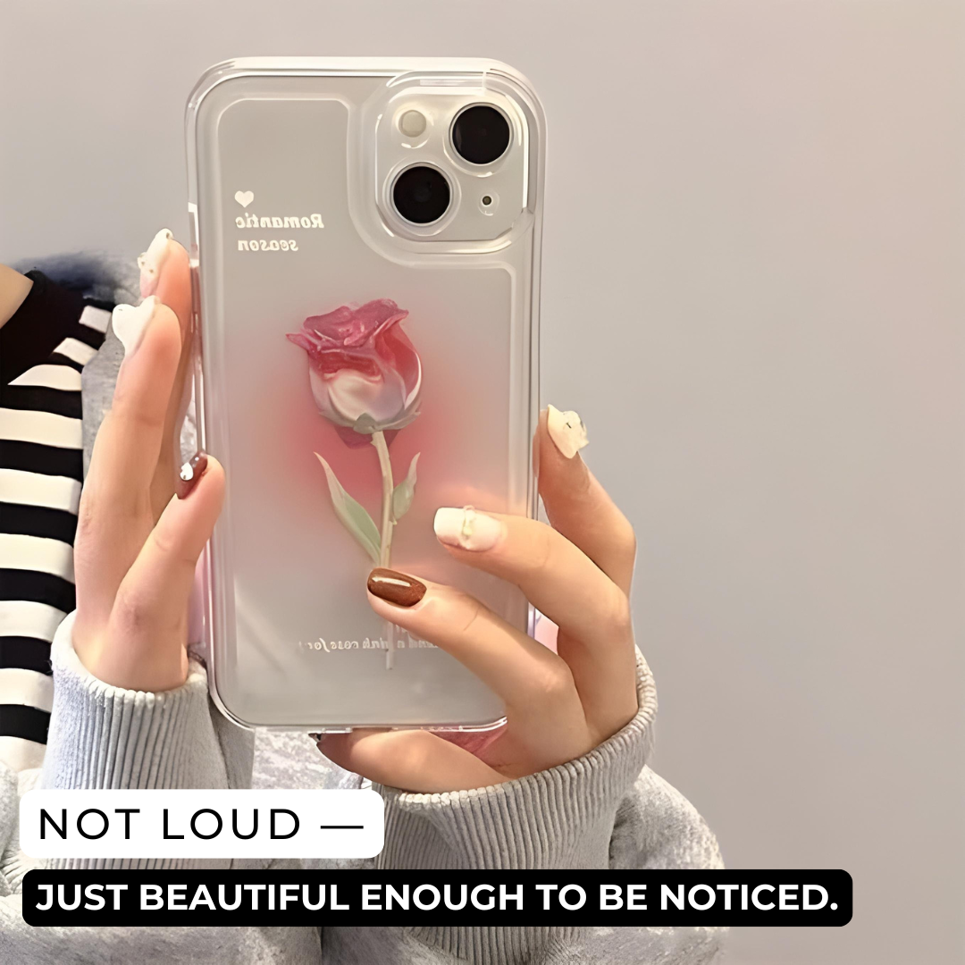 The Sculpted Bloom Case with Blush Halo Detail is designed with a raised rose motif set against a soft blush halo that gives the surface a gentle lit-from-within look. That faded glow behind the bloom adds depth to the design and makes the case feel more considered than a standard floral print. The result is delicate, clean, and visually soft, with a sculpted finish that brings the artwork forward in a subtle way.